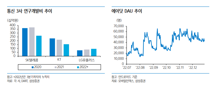 AI 사업을 영위하는 데 있어서 가입자, 데이터, 고객접점, 네트워크에서 강점이 있습니다. 국내 1위 통신 사업자로 3천만 명이 넘는 가입자를 보유하고 있고 많은 데이터를 쌓아왔기 때문에 이러한 자산을 활용해 AI 사업 기반을 빠르게 확대할 것으로 예상합니다. 작년 5월 시장에 공개한 에이닷은 GPT-3을 바탕으로 개발한 서비스입니다. 거대 언어모델의 한국어 특화버전도 자체 개발해 온 만큼 에이닷은 자연스러운 한국어 대화가 가능한 장점을 갖고 있습니다.