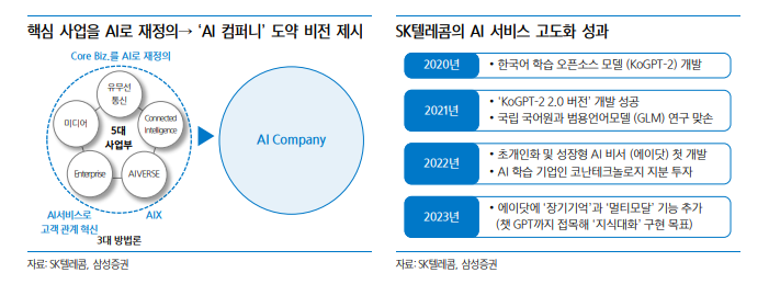 작년 중순에 내놓은 AI 비서 에이닷에 챗 GPT와 같은 초거대 AI를 접목해 AI 서비스를 고도화할 것으로 예상됩니다. SK텔레콤은 21년 11월 인적분할을 통해 2.0 시대를 열며 기술과 서비스로 고객을 이롭게 하는 AI Company를 비전으로 제시할 만큼 많은 공을 들이고 있습니다.