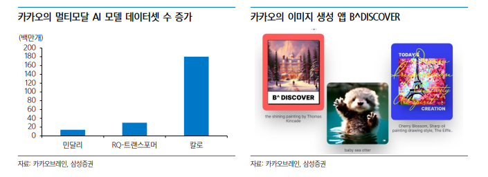 카카오는 언어형 AI모델 KoGPT와 이미지 생성형 멀티모달 AI 칼로(Karlo)를 보유하고 있습니다. 카카오 인공지능 연구소 카카오브레인에서는 네이버보다 반년 뒤인 21년 11월 GPT-3을 기반으로 한국어에 특화된 언어모델 KoGPT를 개발하였습니다.